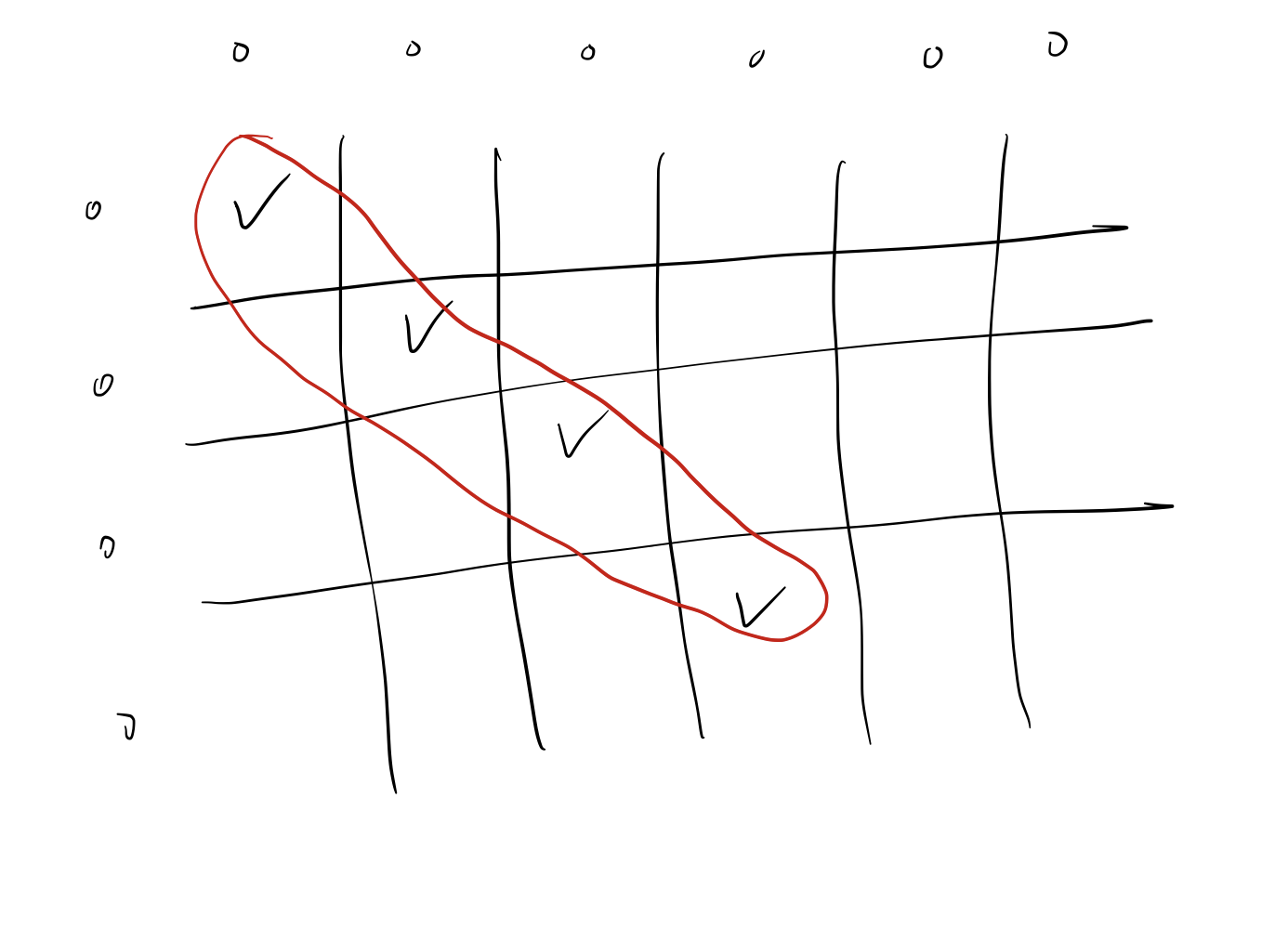 연속 sub array를 판별할 때 nums1과 nums2를 2차원 배열로 매핑하면 대각선이 같으냐 다르냐에 따라 연속인지 아닌지 판별할 수 있다. 즉, 이중루프를 돌면서 각 셀의 문자가 같은지 아닌지 판별하고 같으면 cache[i - 1][j - 1]과 더해줬을때 모든 sub array 경우의 수를 구할 수 있다.